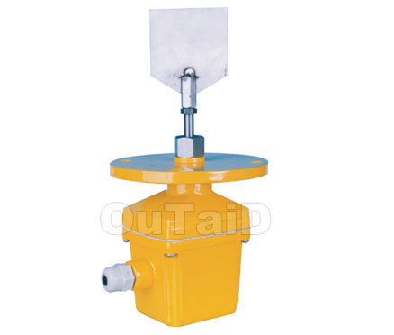 阻旋式料位控制器之叶片是利用传动轴与离合相接,在未接触物料时,马达保持正常运转,当叶片接触物料时,马达会停止转动,机构会同时输出一点信号而测出料位高度或料仓堵塞信号。